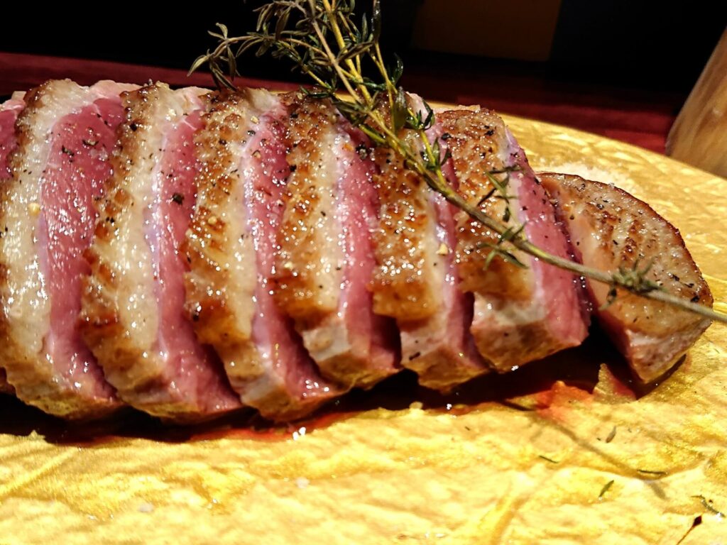 ムネ肉は低温でじっくり火入れし、皮目は香ばしく焼き上げます。内部はしっとりとしたロゼ色を保ち、噛むたびに旨みが広がります。
