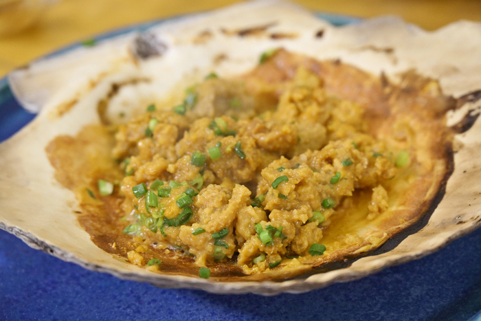 大きな貝殻を器に使い、うにをこんがり焼き上げた郷土料理。