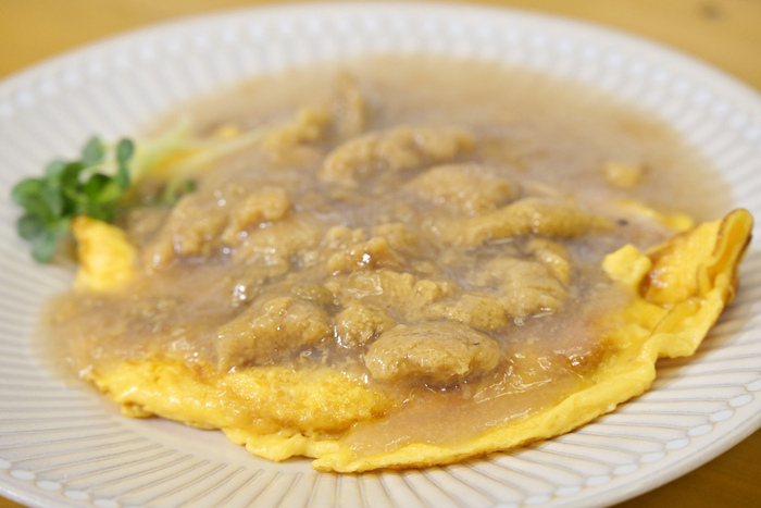 「いちご煮」とは、うにとアワビの贅沢な出汁を使った青森の郷土料理。それをアレンジし、卵でとじてまろやかに仕上げたもの。