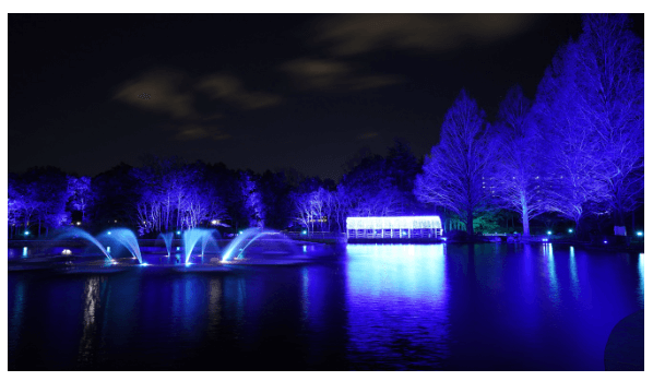 外では、池に映り込む青いライトが夜空と共鳴し、まるで物語のワンシーンのような景色を創り出します。