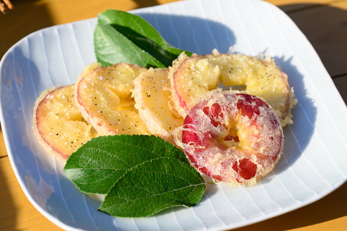 • 天ぷら:薄切りりんごに衣を付けてさっと揚げるだけ