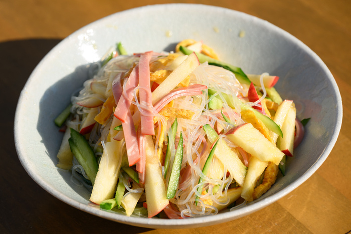 シャキッとしたりんごの歯ざわりと、ツルツルとした春雨の食感が抜群のハーモニーを生み出しています。