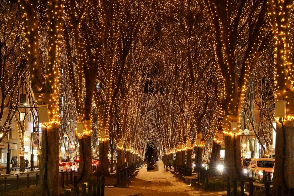東北屈指の並木道として知られるこの通りは、ページェント期間中は全長700mほどがまるごと光の回廊へと変わります。