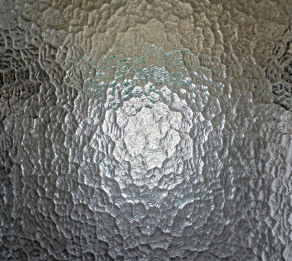 昭和の日本家屋に欠かせなかった「型板ガラス」は、凹凸のある表面にさまざまな模様が彫られた装飾ガラスです。玄関やお風呂場、室内の扉や窓に使われてきました。例えば夜空の星、草花、小紋柄、幾何学模様など、多彩なパターンが存在します。光をやさしく拡散し、外からの視線を遮りつつも、家の中に温かな光を届ける役割を果たしていました。