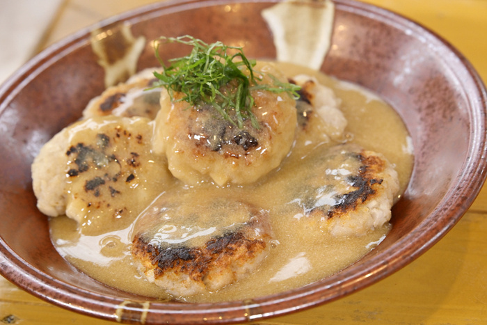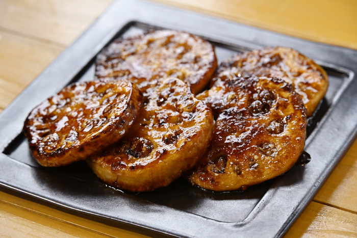 厚切りの市川蓮根をじっくり焼いた一品。表面はカリッと香ばしく、中はもちもちホクホク。野菜とは思えない力強さで、噛むほどに大地の香りが楽しめます。櫻井翔さんも最も感動したメニューの一つ。