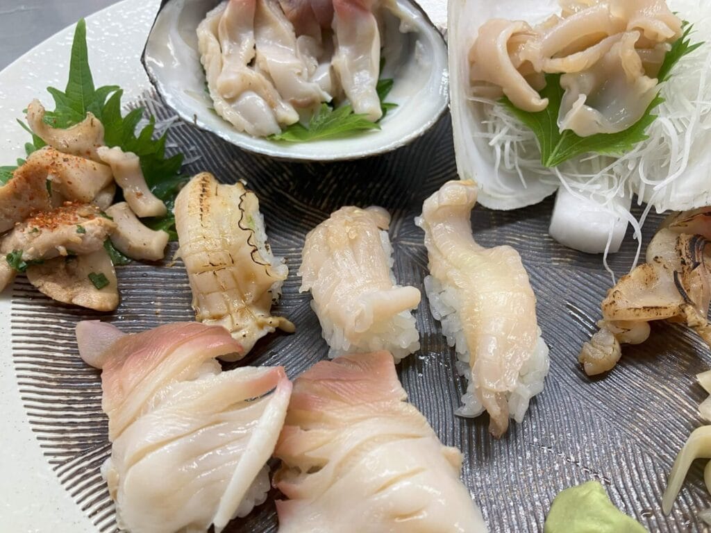 まずは新鮮そのものの刺身。漁港で水揚げしたばかりの黒ホッキ貝を丁寧に捌き、氷水でしめていただきます。一口食べると、想像以上の“コリコリ感”と“じゅわっと甘い旨み”が広がり、噛みしめるほどに磯の香りが鼻に抜けます。貝類の刺身の中でもトップクラスの食感です。