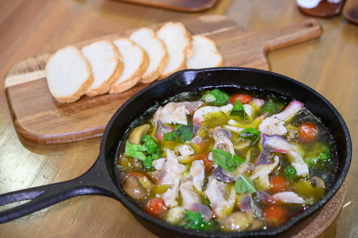 オリーブオイル&ニンニクで煮込んだアヒージョは、貝の旨みがオイルに溶け出し、パンにつけて最後まで余さず堪能できます。おもてなし料理にもピッタリ。