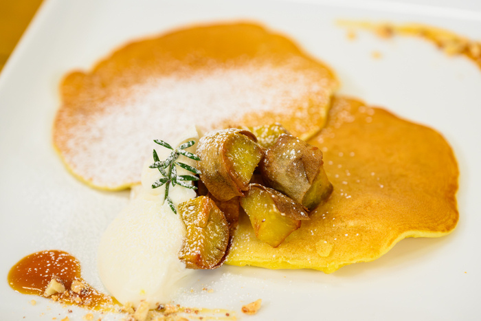 さつまいものやさしい甘さがバターやメープルシロップとベストマッチ!朝食にもデザートにもおすすめ。番組スタッフの間でも「今までで一番美味しいパンケーキ」と話題になりました。