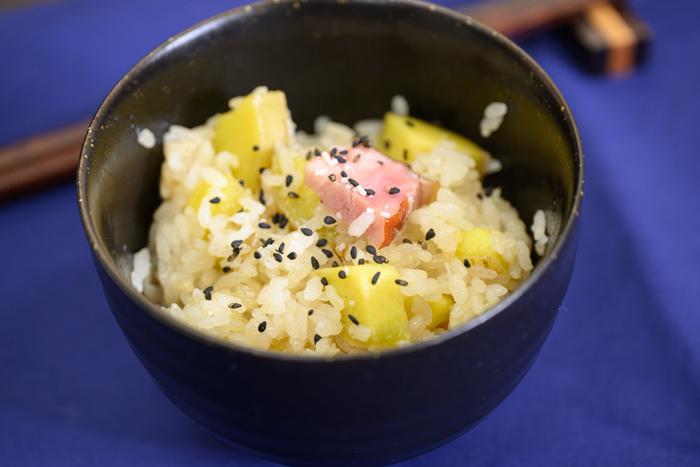 角切りにしたきみまろこをご飯と一緒に炊き上げ、バターで仕上げる新感覚レシピ。