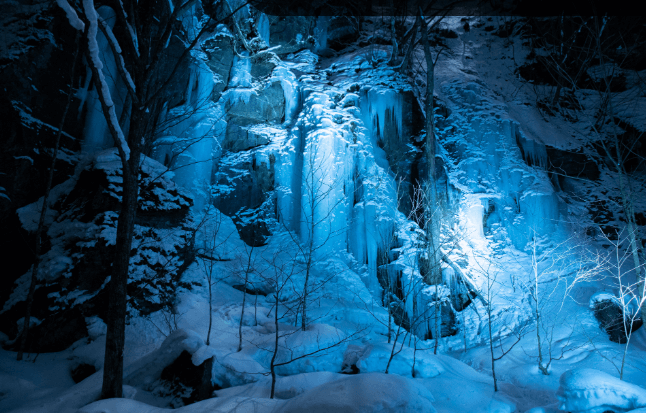 気温がグッと下がる夜には、ダイナミックな滝が丸ごと凍りつきます。巨大な氷の彫刻のような姿は、思わず息を呑む絶景。昼間の陽光の下とはまた違う、ライトアップによる“青い氷”の神秘を堪能できます。